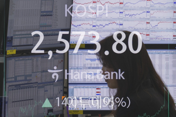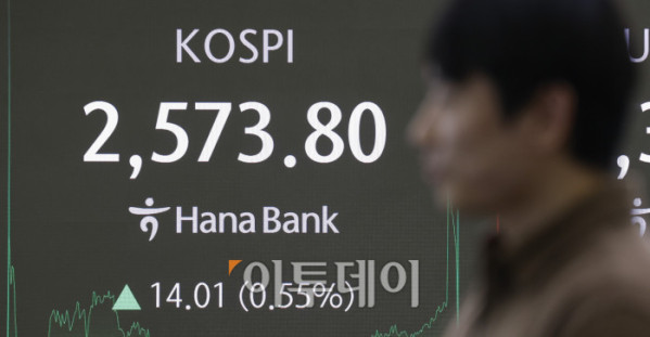 ▲코스피가 미중 무역협상 기대감에 2570선으로 상승 마감한 7일 서울 중구 하나은행 딜링룸 전광판에 코스피, 원·달러 환율이 표시돼 있다. 이날 코스피 지수는 전 거래일보다 14.01(0.55%) 포인트 상승한 2573.80을 나타냈다. 조현호 기자 hyunho@