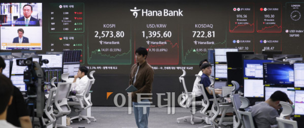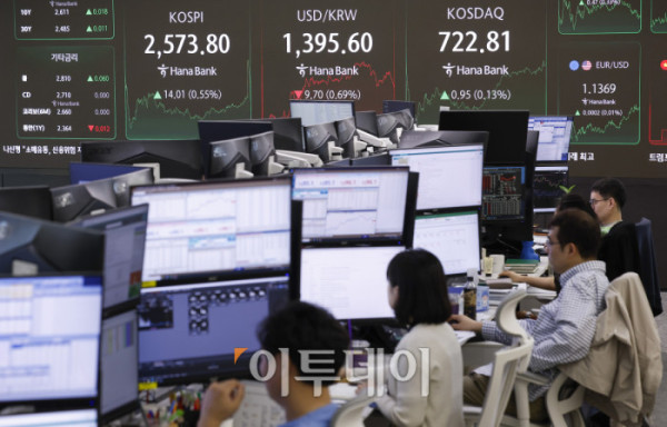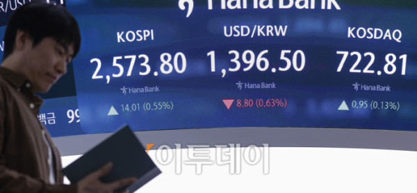 코스피가 미중 무역협상 기대감에 2570선으로 상승 마감한 7일 서울 중구 하나은행 딜링룸 전광판에 코스피, 코스닥, 원·달러 환율이 표시돼 있다. 이날 코스피 지수는 전 거래일보다 14.01(0.55%) 포인트 상승한 2573.80을 코스닥 지수는 0.95(0.13%)포인트 상승한 722.81을 나타냈다. 원·달러 환율은 종가 기준 1396.50원을 나타냈다. 조현호 기자 hyunho@