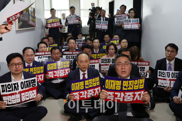 ▲7일 서울 여의도 국회 법제사법위원회 전체회의장 앞에서 권성동(앞줄 가운데) 국민의힘 원내대표를 비롯한 여당 의원들이 '이재명 면죄입법 즉각중지' 등의 내용이 적힌 피켓을 들고 구호를 외치고 있다. 이날 법사위는 소위원회를 열어 대통령 당선 시 진행 중인 형사재판을 정지하도록 하는 내용의 형사소송법 개정안을 의결했다. 고이란 기자 photoeran@