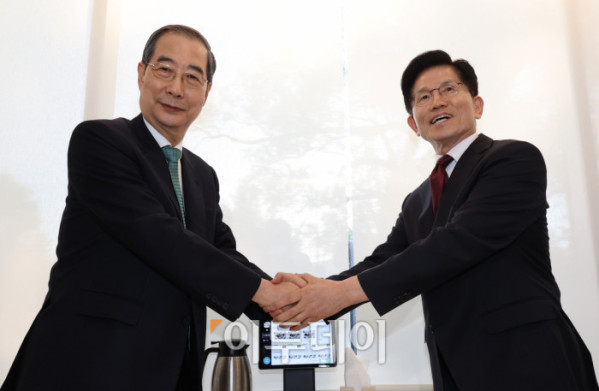 ▲김문수(왼쪽) 국민의힘 대선후보와 한덕수 무소속 대선 예비후보가 7일 서울 종로구의 한 식당에서 후보 단일화 관련 회동을 하고 있다. 조현호 기자 hyunho@