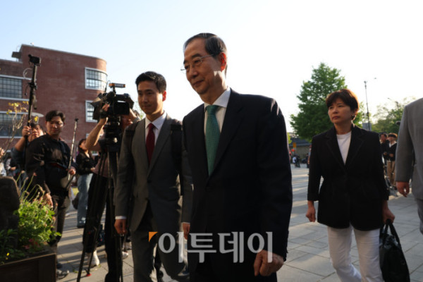 ▲한덕수 무소속 대선 후보가 7일 서울 종로구 한 음식점에서 김문수 국민의힘 대선 후보와 단일화 관련 논의를 위해 식당에 들어서고 있다. 조현호 기자 hyunho@