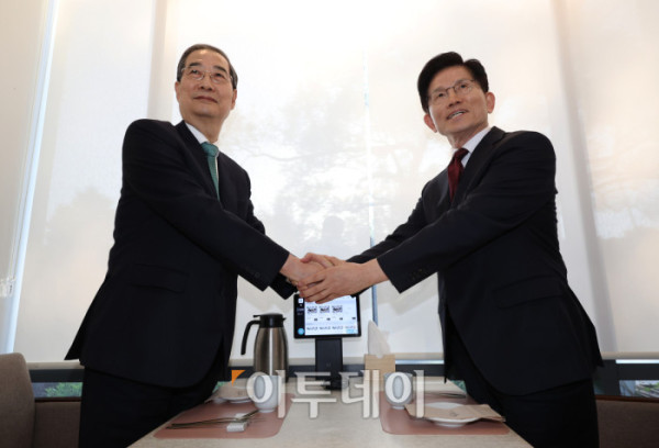 ▲김문수(오른쪽) 국민의힘 대선후보와 한덕수 무소속 대선 예비후보가 7일 서울 종로구의 한 식당에서 후보 단일화 관련 회동을 하고 있다. 조현호 기자 hyunho@