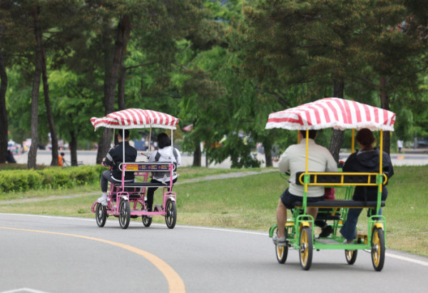 ▲6일 서울 영등포구 여의도한강공원에서 시민들이 자전거를 타며 휴식을 취하고 있다. (연합뉴스)