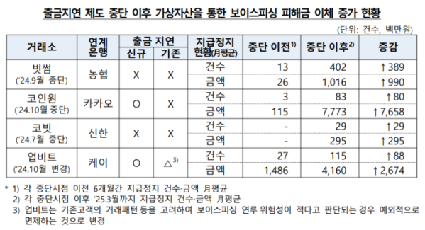 이에 당국은 가상자산 시장이 보이스피싱 피해금 세탁의 주된 창구로 악용될 우려가 있다고 간주해 출금지연제도의 충실한 운영을 장려했다. 빗썸, 코인원, 코빗은 약관 개정 및 전산 시스템 정비를 거쳐 이달 중 출금지연제도를 재개할 방침이다.