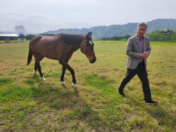 "유니콘의 나이는 24세로 사람으로 치면 90세로 볼 수 있지만 지금 한눈에 보기에도 건강해 보이지 않습니까? 말 학대 사건의 피해 마필로 발견 당시 처참한 모습이었지만, 이곳에 와서 잘 먹고 넓은 초지를 뛰놀며 지내는 것은 물론, 마사회의 말 전문 수의사 등 전문인력이 직접 보살피니 이렇게 건강하게 생활하고 있습니다"