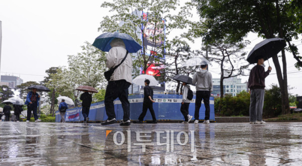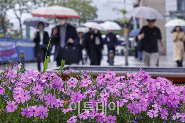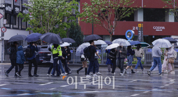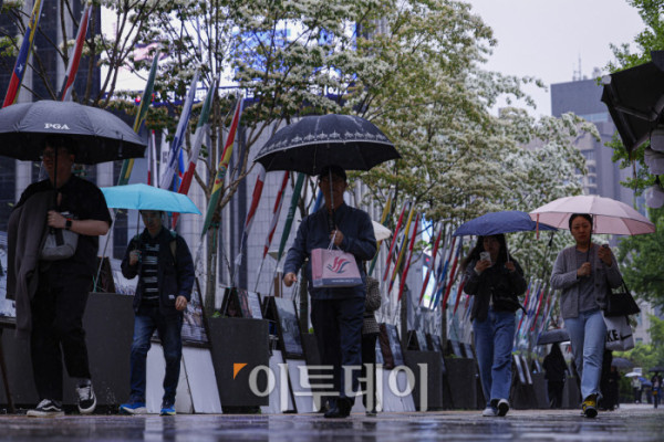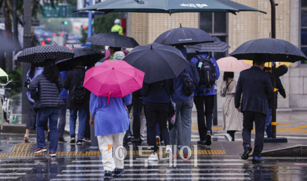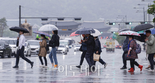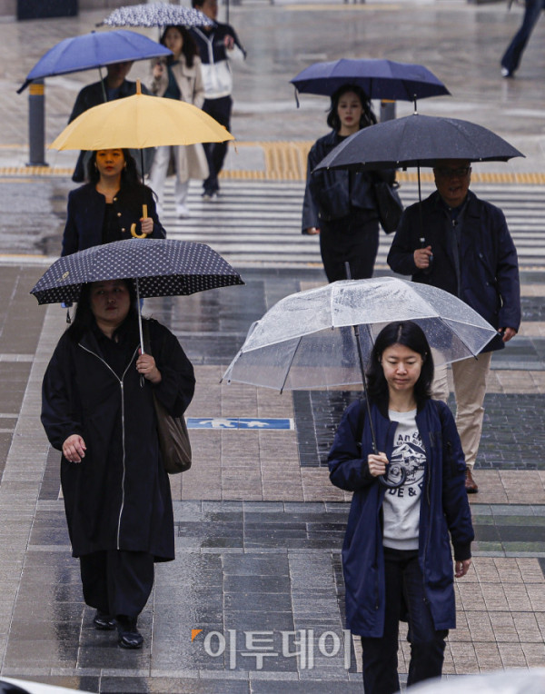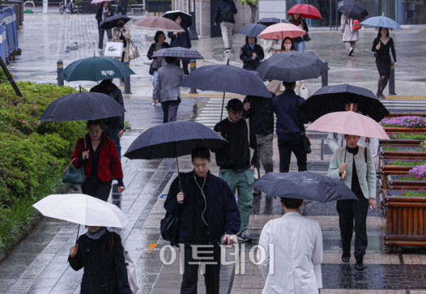 ▲전국에 비가 내린 9일 서울 종로구 광화문역 일대에서 우산을 쓴 시민들이 비를 피해 발걸음을 옮기고 있다. 기상청에 따르면 중국 상하이 부근에서 서해상으로 이동하는 저기압의 영향을 받아 전국이 대체로 흐리고 비가 내리겠다고 예보했다. 이날 아침 최저기온은 10~15도, 낮 최고기온은 15~20도로 주말까지 평년보다 쌀쌀한 날씨가 이어질 전망이다. 조현호 기자 hyunho@