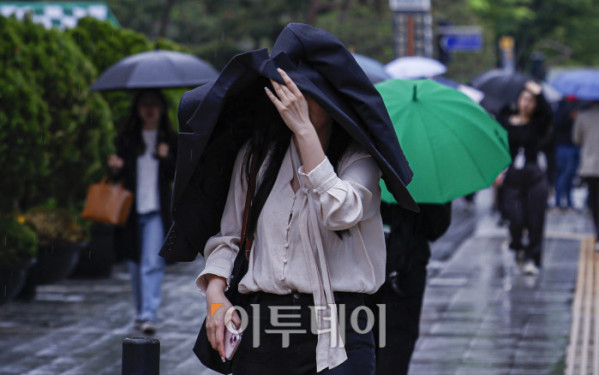 ▲전국에 비가 내린 9일 서울 종로구 광화문역 일대에서 우산을 준비하지 못한 한 시민이 외투로 비를 피하며 발걸음을 옮기고 있다. 기상청에 따르면 중국 상하이 부근에서 서해상으로 이동하는 저기압의 영향을 받아 전국이 대체로 흐리고 비가 내리겠다고 예보했다. 이날 아침 최저기온은 10~15도, 낮 최고기온은 15~20도로 주말까지 평년보다 쌀쌀한 날씨가 이어질 전망이다. 조현호 기자 hyunho@