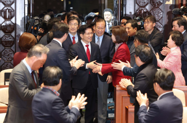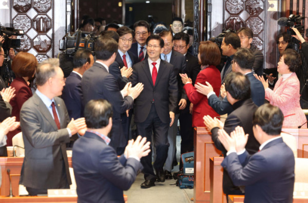 ▲김문수 국민의힘 대선후보와 권영세 비대위원장 등이 9일 서울 여의도 국회에서 열린 국민의힘 의원총회에서 권성동 원내대표의 발언을 듣고 있다. 신태현 기자 holjjak@