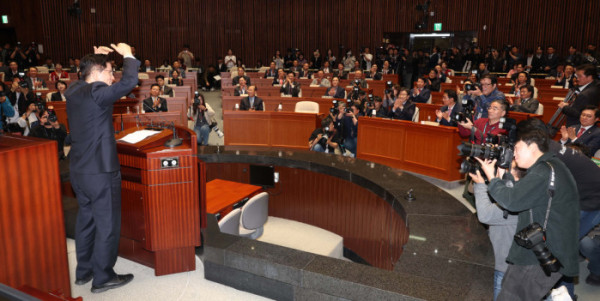 ▲권성동 국민의힘 원내대표가 9일 서울 여의도 국회에서 열린 국민의힘 의원총회에서 발언하고 있다. 신태현 기자 holjjak@