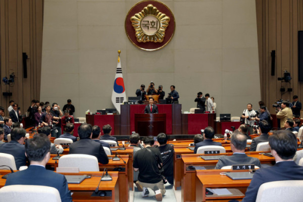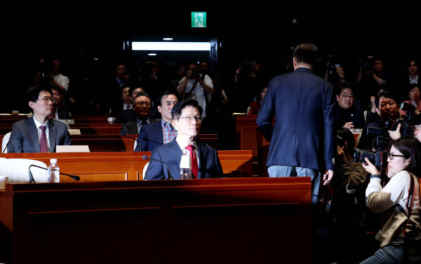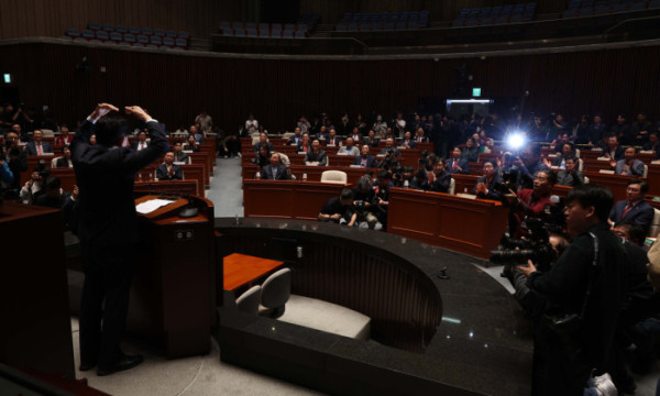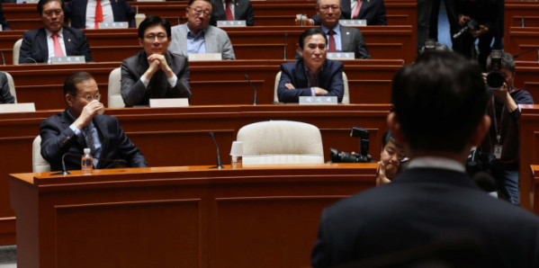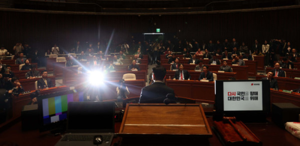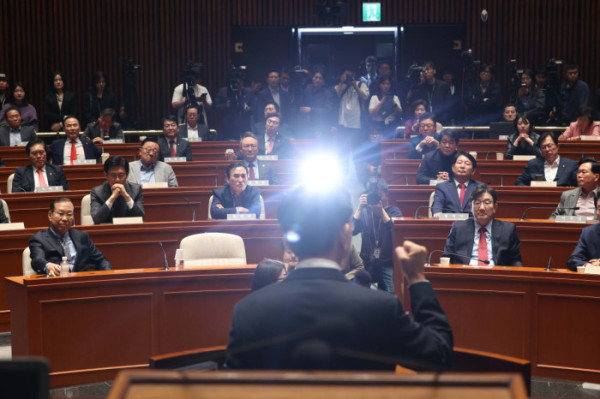 ▲김문수 국민의힘 대선후보가 9일 서울 여의도 국회에서 열린 국민의힘 의원총회에서 권영세 비대위원장이 “대단히 실망스럽다”고 발언한뒤 퇴장하자 자리를 지키고 있다. 신태현 기자 holjjak@