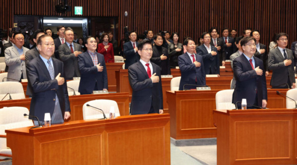 ▲김문수 국민의힘 대선후보, 권영세 비대위원장, 권성동 원내대표 등이 9일 서울 여의도 국회에서 열린 국민의힘 의원총회에서 국민의례를 하고 있다. 신태현 기자 holjjak@