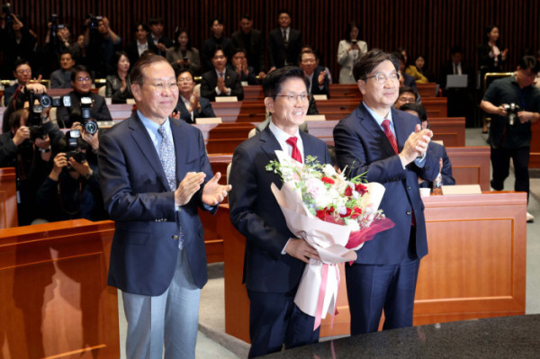 ▲김문수 국민의힘 대선후보가 9일 서울 여의도 국회에서 열린 국민의힘 의원총회에서 권영세 비대위원장, 권성동 원내대표에게 꽃다발을 받은 뒤 기념촬영을 하고 있다. 신태현 기자 holjjak@