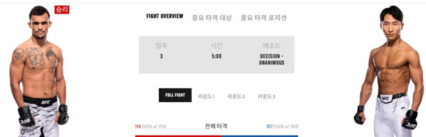 11일(한국시간) 캐나다 퀘벡주 몬트리올시 벨 센터에서 열린 'UFC 315: 무하마드 vs 델라 마달레나' 파이트패스 언더카드 페더급 경기에 나섰던 이정영이 다니엘 산토스(브라질)에게 무릎을 꿇었다. 이정영은 3라운드 동안 분투했지만, 만장일치 판정패를 당했다. 세 명의 심판의 판정 결과는 30-27이었다. 이로써 이정영은 UFC 데뷔 후 2연패를 기록하며, 전적은 11승 3패가 됐다.