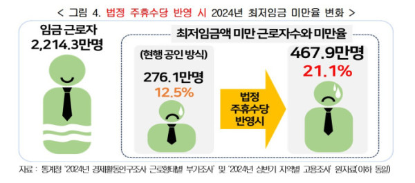 경총은 법정 주휴수당을 반영해 최저임금 미만율을 재분석하면 지난해 최저임금을 받지 못한 근로자 수가 467만9000명(21.1%)에 달한다고 밝혔다. 이는 현재 공식 미만율(12.5%)보다 8.6%p 높은 수치로, 약 192만 명의 근로자가 누락돼 있다는 분석이다.