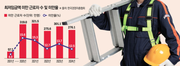 한국경영자총협회가 11일 발표한 ‘2024년 최저임금 미만율 분석’ 보고서에 따르면 지난해 법정 최저임금인 시급 9860원을 받지 못한 근로자는 276만1000명에 달한 것으로 집계됐다. 전체 임금근로자의 12.5% 수준이다.