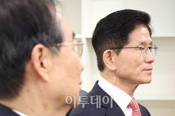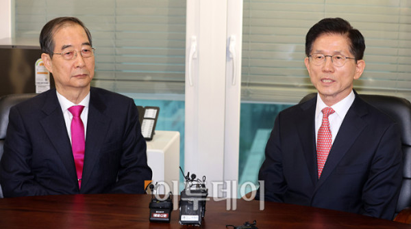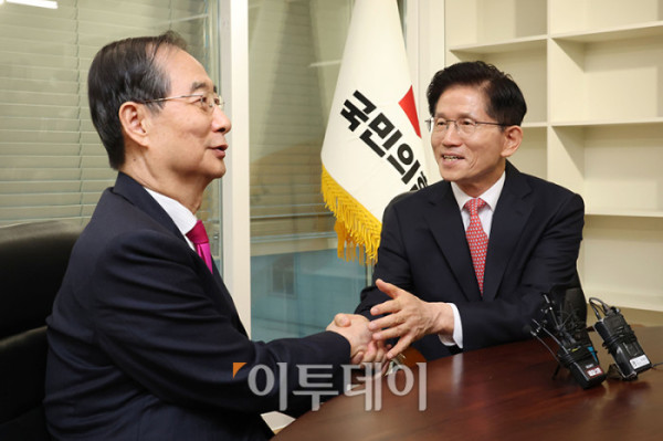 ▲김문수(오른쪽) 국민의힘 대선후보와 한덕수 전 국무총리가 11일 서울 여의도 국민의힘 당사 대선후보 사무실에서 회동을 하고 있다. 고이란 기자 photoeran@