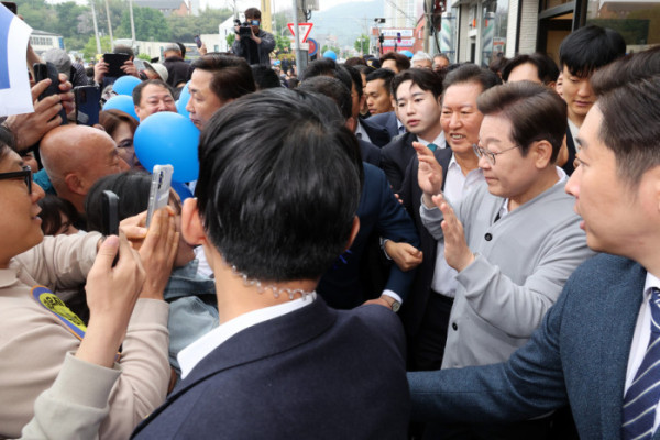 ▲민심을 청취하는 '경청 투어'에 나선 이재명 더불어민주당 대선후보가 11일 전남 화순군 화순읍 인근 거리에서 경호를 받으며 주민들에게 인사하고 있다. (사진=뉴시스)