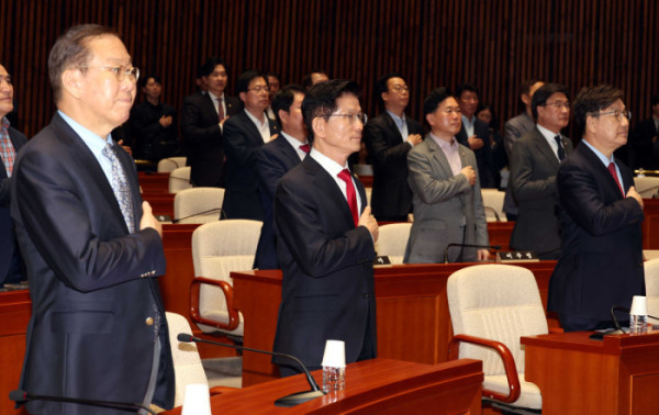 ▲김문수 국민의힘 대선후보가 9일 서울 여의도 국회에서 열린 의원총회에서 국민의례를 하고 있다. 앞줄 왼쪽부터 권영세 비대위원장, 김 후보, 권성동 원내대표. (사진=뉴시스)