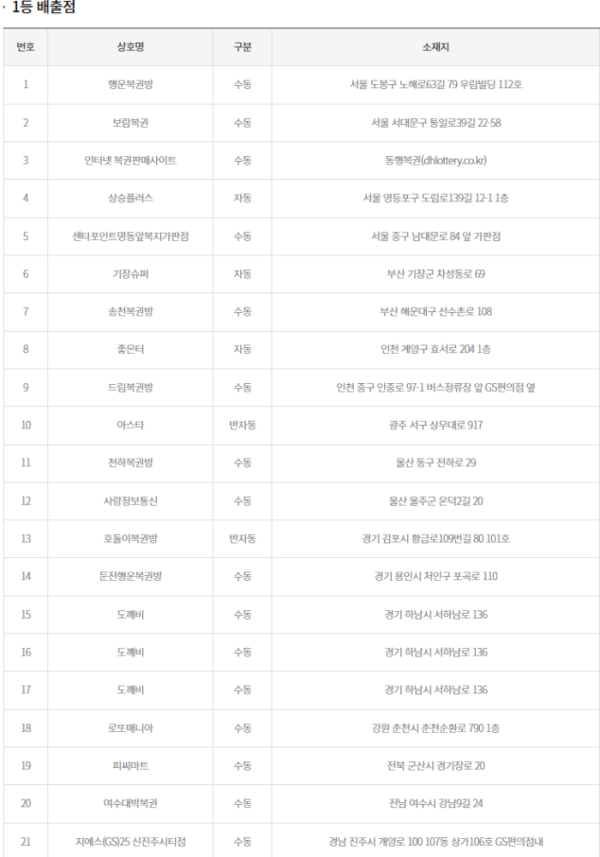 로또 1등 당첨자를 배출한 곳은 서울 도봉구 노해로63길 '행운복권방', 서울 서대문구 통일로39길 '보람복권', 서울 영등포구 도림로139길 ‘상승플러스’, 서울 중구 남대문로 ‘센타포인트명동앞복지가판점’, 경기 김포시 황금로109번길 ‘호돌이복권방’, 경기 용인시 처인구 포곡로 ‘둔전행운복권방’, 경기 하남시 서하남로 ‘도깨비’ 3명, 인천 계양구 효서로 '좋은터', 인천 중구 인중로 '드림복권방', 부산 기장군 차성동로 ‘기장슈퍼’, 부산 해운대구 선수촌로 ‘송천복권방’, 울산 동구 전하로 ‘천하복권방’, 울산 울주군 온덕2길 ‘사랑정보통신’, 광주 서구 상무대로 ‘아스타’, 강원 춘천시 춘천순환로 ‘로또매니아’, 전북 군산시 경기장로 ‘피씨마트’, 전남 여수시 강남9길 ‘여수대박복권’, 경남 진주시 개양로 ‘지에스(GS)25 신진주시티점’, 인터넷 복권판매사이트 ‘동행복권’ 등 21곳이다.