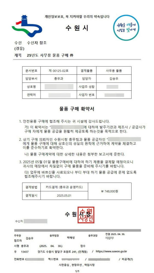 12일 수원시에 따르면 지역 내 컴퓨터 판매업체를 운영하는 A 씨는 4월 30일 '수원시 소속 주무관'이라고 신분을 밝힌 B 씨의 전화를 받았다. B 씨는 사무용 물품 견적을 요청하며 통화를 마친 후에는 수원시 명의로 작성된 ‘물품구매 확약서’ 형식 공문을 보냈다. 가짜 공문이었다.