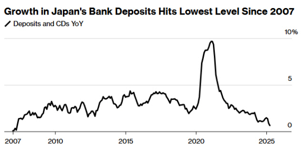 일본은행이 발표한 보고서에 따르면 4월 은행 예금은 전년 동월 대비 0.66% 증가했다. 3개월 연속 감소이자 2007년 4월 이후 최저다.