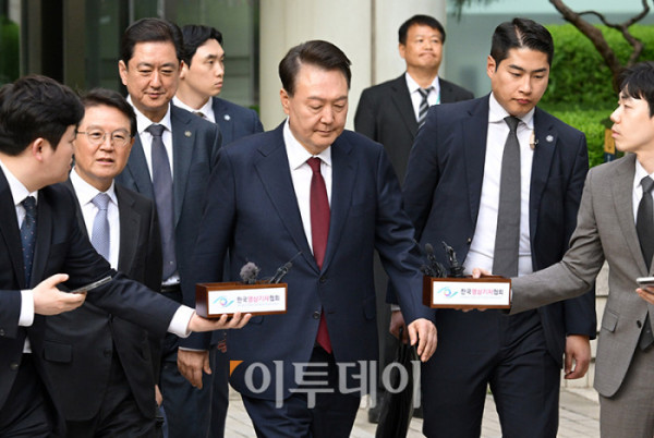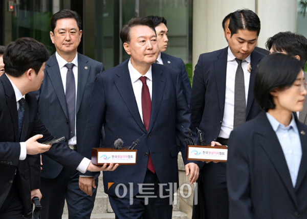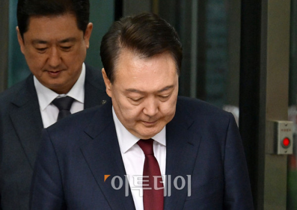 ▲12·3 비상계엄 사태와 관련해 내란 우두머리 혐의 등으로 기소된 윤석열 전 대통령이 12일 서울 서초구 서울중앙지방법원에서 열린 3차 공판을 마친 뒤 법원을 나서고 있다. 사진공동취재단