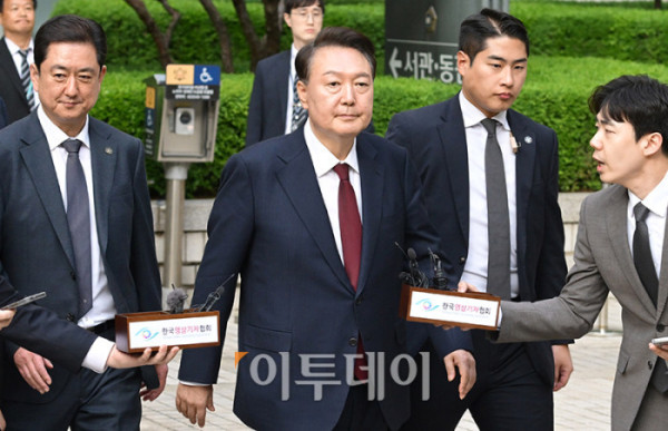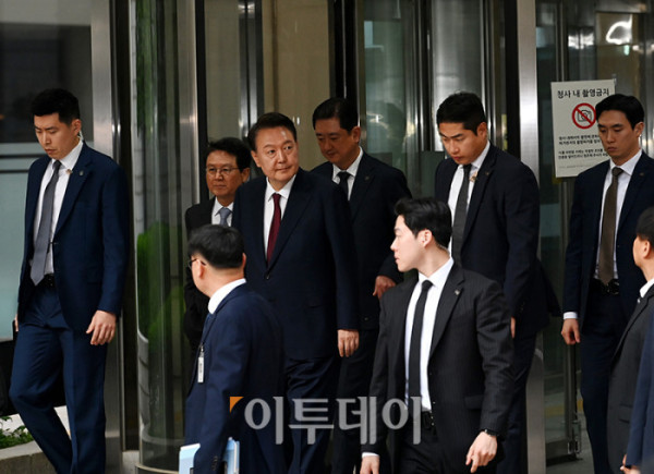 12·3 비상계엄 사태와 관련해 내란 우두머리 혐의 등으로 기소된 윤석열 전 대통령이 12일 서울 서초구 서울중앙지방법원에서 열린 3차 공판을 마친 뒤 법원을 나서고 있다. 사진공동취재단