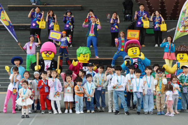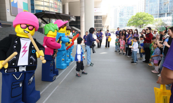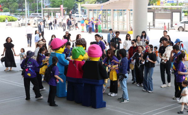 ▲레고랜드가 13일 서울 용산구 용산역광장에서 ‘레고 페스티벌’ 홍보를 위한 ‘플레이 팝 (Play & Pop-up)’행사를 갖고 레고 페스티벌의 대표 마스코트와 공연단 등이 어린이들과 기념촬영을 하고있다. 내달 11일 UN이 지정한 세계놀이의 날을 맞이해 진행중인 놀이 축제 ‘레고 페스티벌’은 6월 14일까지 춘천 레고랜드에서 진행된다. 신태현 기자 holjjak@