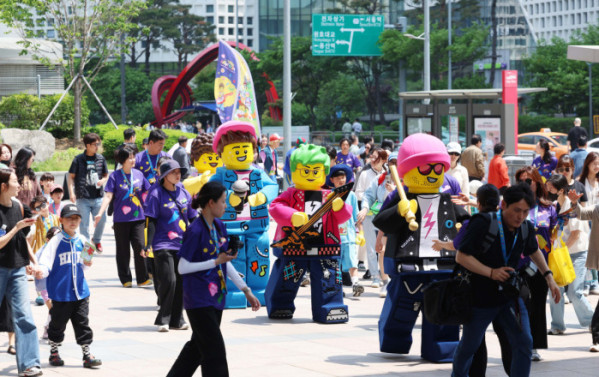 레고랜드가 13일 서울 용산구 용산역광장에서 ‘레고 페스티벌’ 홍보를 위한 ‘플레이 팝 (Play & Pop-up)’행사를 갖고 레고 페스티벌의 대표 마스코트와 공연단 등이 플래그 행렬을 선보이고 있다. 내달 11일 UN이 지정한 세계놀이의 날을 맞이해 진행중인 놀이 축제 ‘레고 페스티벌’은 6월 14일까지 춘천 레고랜드에서 진행된다.