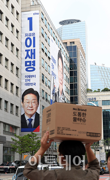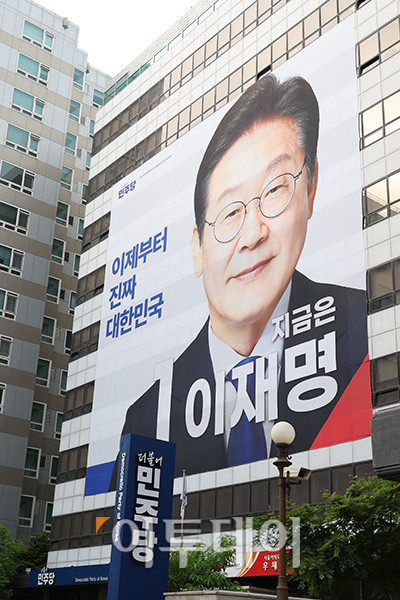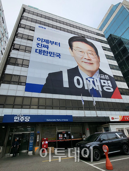 ▲21대 대선 공식 선거운동 이틀째인 13일 서울 여의도 더불어민주당 서울시당 당사에 이재명 대선후보 현수막이 걸려있다. 고이란 기자 photoeran@