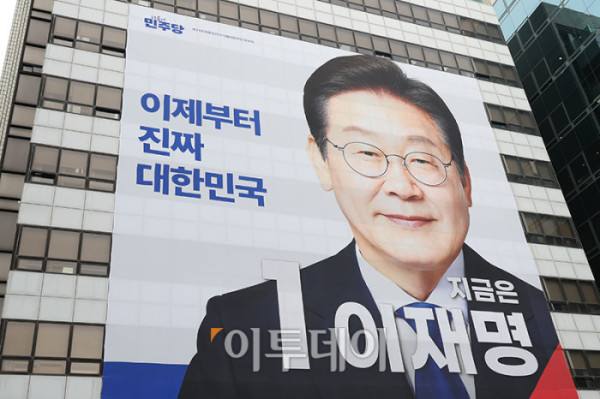 ▲21대 대선 공식 선거운동 이틀째인 13일 서울 여의도 더불어민주당 당사에 이재명 대선후보 현수막이 걸려있다. 고이란 기자 photoeran@
