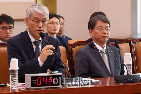 ▲김용빈 중앙선거관리위원회 사무총장이 14일 서울 여의도 국회에서 열린 법제사법위원회 전체회의에서 의원 질의에 답하고 있다. 고이란 기자 photoeran@