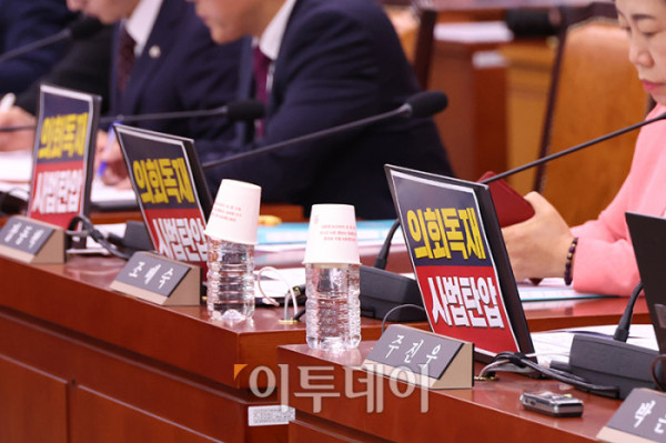 ▲14일 서울 여의도 국회에서 열린 법제사법위원회 전체회의에서 국민의힘 의원들이 '의회독재, 사법탄압' 피켓을 노트북 앞에 붙이고 있다. 고이란 기자 photoeran@