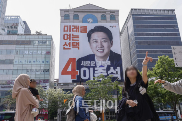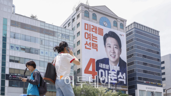 ▲제21대 대선 공식 선거운동이 시작된 가운데 13일 서울 서초구에 위치한 이준석 개혁신당 대통령후보 캠프 건물에 대형 현수막이 걸려있다. 조현호 기자 hyunho@