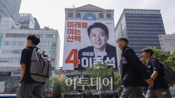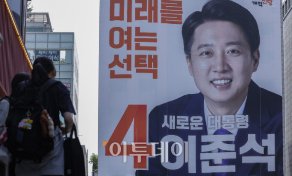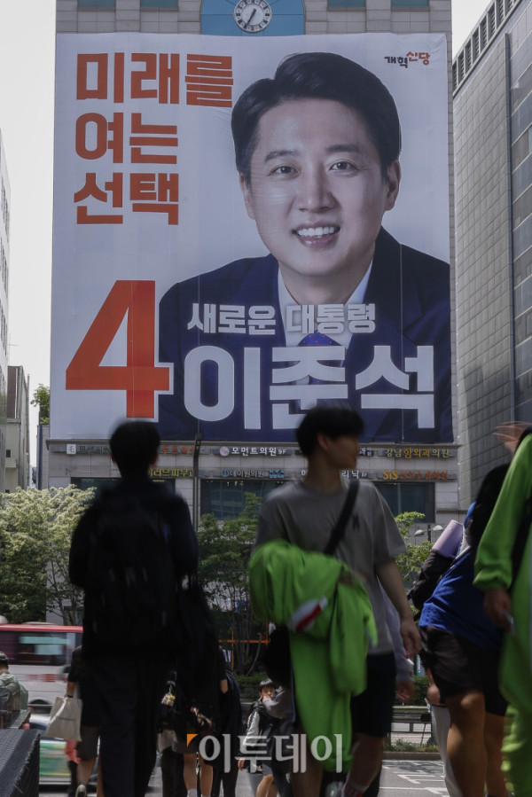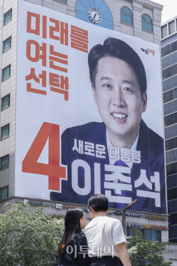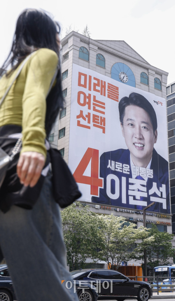 제21대 대선 공식 선거운동이 시작된 가운데 13일 서울 서초구에 위치한 이준석 개혁신당 대통령후보 캠프 건물에 대형 현수막이 걸려있다. 조현호 기자 hyunho@R]