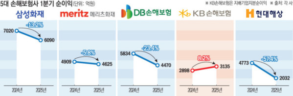 5대 손해보험사가 올해 1분기 우울한 경영성적표를 받아들었다. 순이익 '2조 원 선'은 겨우 지켰지만 수익성을 압박하는 겹악재의 직격탄을 맞았다.