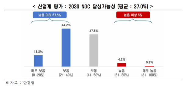 또 2030 국가온실가스 감축목표(NDC)의 달성 가능성을 37.0%로 ‘낮음’ 수준으로 봤다. 특히 응답기업의 과반(57.5%)이 달성 가능성이 낮다고 진단했다. 달성 가능성이 높다는 응답은 5.0%에 불과했다.