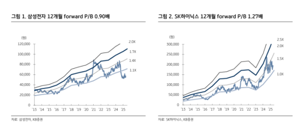 이번 계약은 AI 반도체 수요 확대뿐 아니라 이를 뒷받침할 고대역폭메모리(HBM) 및 DDR5 등 첨단 메모리 수요 증가로 이어질 것이라는 점에서 삼성전자와 SK하이닉스가 대표 수혜주로 주목된다. 실제로 양사의 12개월 선행 주가순자산비율(P/B)는 각각 0.90배, 1.27배 수준으로 밸류에이션에는 이미 상당한 불확실성이 반영된 상황이다.