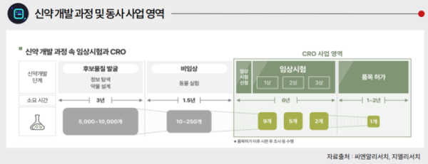 박창윤 지엘리서치 연구원은 "CRO 산업은 신약, 개량신약 등 의약품 개발 과정에서 연구 및 개발을 대행하는 매우 전문적인 사업으로, 다국적 제약사와 바이오 제약기업들은 일원화됐던 과정을 분리해 아웃소싱으로 진행하는 사례가 매년 증가하고 있다"라며 "글로벌 임상 CRO 시장은 2027년까지 연평균 성장률(CAGR)을 10.5%를 기록하며 1082억 달러(약 152조 원) 규모로 매년 증가할 전망"이라고 전했다.