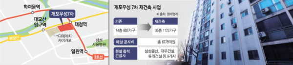 1987년 입주한 개포우성7차는 재건축을 통해 14층, 802가구 규모에서 최고 35층, 1122가구의 대단지로 재탄생 할 예정이다. 조합이 밝힌 예상 공사비는 총 6778억 원으로, 3.3㎡ 당 880만 원에 이른다. 개포우성7차 조합은 오는 6월 입찰을 마감하고 8월 시공사 선정에 나설 예정이다.