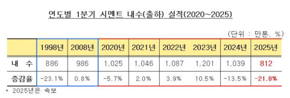 1분기 기준 시멘트 내수 출하량은 2020년 코로나 팬데믹 초기 공급망 교란과 글로벌 경기침체로 부진을 겪으면서도 한 자릿수 감소율(5.7%)에 불과했다. 1998년 IMF 외환위기에 돌입한 첫해 1분기 내수 판매가 23.1% 감소해 886만t을 기록한 바 있다.