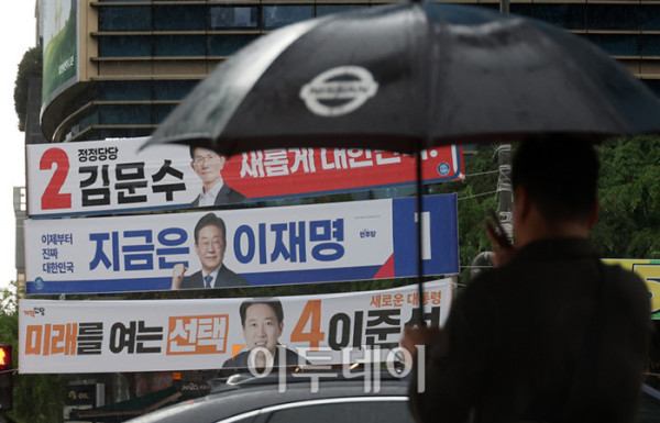 ▲주요 대선 후보의 첫 TV 토론회를 앞둔 16일 서울 마포구 공덕역 인근에 대선 후보 현수막이 걸려있다. 중앙선거방송토론위원회 주최로 18일 오후 8시부터 2시간 동안 서울 상암 SBS 스튜디오에서 열리는 이번 토론회에는 더불어민주당 이재명, 국민의힘 김문수, 개혁신당 이준석, 민주노동당 권영국 후보가 참석할 예정이다. 고이란 기자 photoeran@