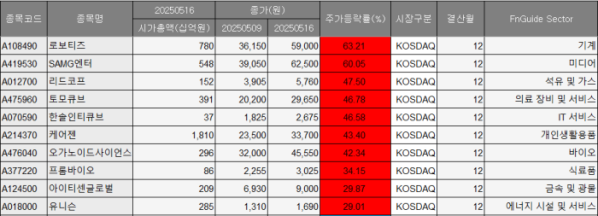그외 리드코프(47.50%), 토모큐브(46.78%), 한솔인티큐브(46.58%), 케어젠(43.40%), 오가노이드사이언스(42.34%), 프롬바이오(34.15%), 아이티센글로벌(29.87%) 등이 올랐다.