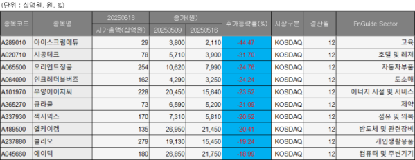 한 주간 코스닥 시장에서 가장 많이 내린 종목은 아이스크림에듀로, 44.47% 내린 2110원에 거래를 마쳤다. '한덕수 테마주'로 분류되는 아이스크림에듀는 지난 주말, 한 전 국무총리가 대선 후보에서 최종 탈락하면서 급락한 것으로 해석된다. 또 다른 '한덕수 테마주'인 시공테크도 31.70% 내린 3900원을 기록했다.