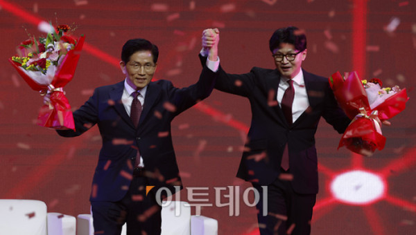 ▲3일 경기 일산 킨텍스 제1전시장에서 열린 국민의힘 대선 후보 선출을 위한 제5차 전당대회에서 김문수(왼쪽) 후보가 대선 후보로 당선되자 한동훈 후보가 축하하고 있다. 고이란 기자 photoeran@