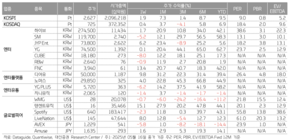 그러면서 "디어유는 6월 말 중국 서비스 출시 기대감 및 NCT위시·라이즈 입점 효과에 따른 실적 반등 전망에 업종 내 최고 상승률을 기록했다"며 "JYP는 2분기 호실적 기대감 반영되며 주가 반등세가 성공했다"고 덧붙였다.