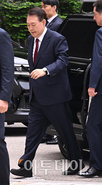 ▲윤석열 전 대통령이 19일 서울 서초구 중앙지방법원에서 열린 내란 우두머리 혐의, 직권남용 권리행사방해 혐의 사건 4차 공판에 출석하고 있다. 사진공동취재단