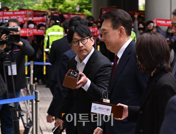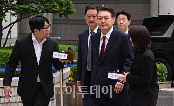 윤석열 전 대통령이 19일 서울 서초구 중앙지방법원에서 열린 내란 우두머리 혐의, 직권남용 권리행사방해 혐의 사건 4차 공판에 출석하고 있다. 사진공동취재단