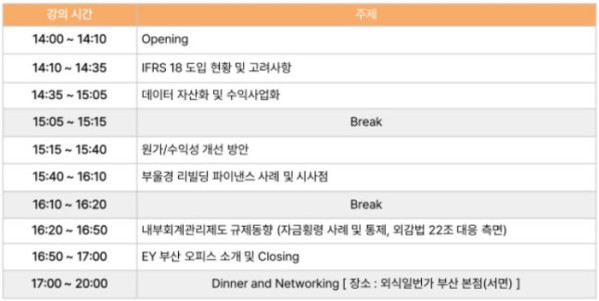이번 세미나는 부울경 기업들의 회계·재무 전략 수립과 경영 효율성 강화를 지원하기 위해 마련됐다. EY한영 소속 회계감사, 전략·재무 자문, 컨설팅 분야 전문가들이 강연자로 참석해 최신 회계 제도 변화와 산업구조 전환에 대응할 인사이트를 제공한다.
