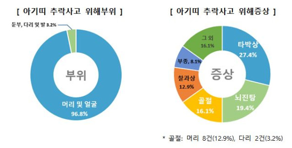 아기 띠 추락사고의 주요 부위는 '머리 및 얼굴'이 96.8%(60건)로 가장 많았고, '둔부, 다리 및 발' 3.2%(2건)가 뒤를 이었다. 머리가 상대적으로 무거운 영유아의 신체 특성상 추락 시 머리부터 떨어지는 경우가 많았기 때문으로 분석된다. 특히 영유아 3명 중 1명은 추락하면서 뇌진탕(12건·19.4%)이나 두개골 골절(8건·12.9%) 등 중증 상해를 입은 것으로 나타났다.